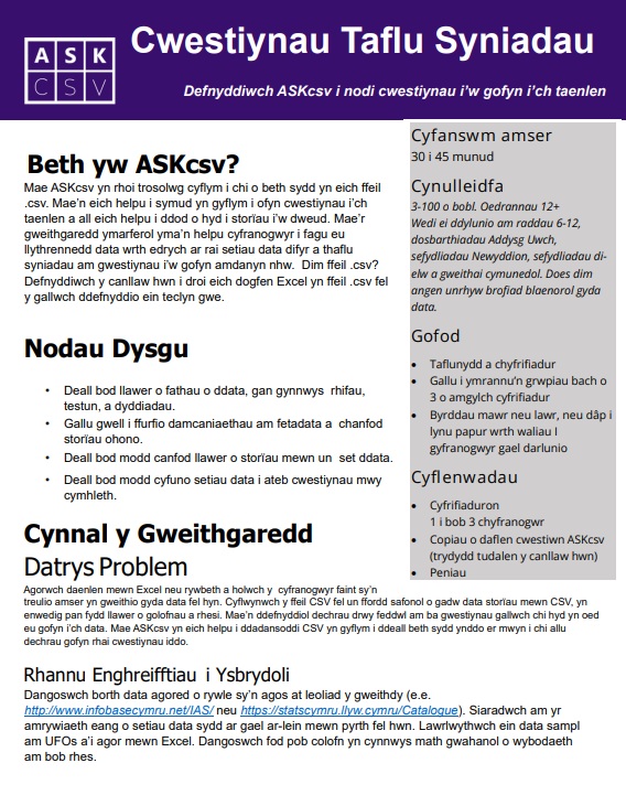 Mae data yn cyrraedd ar garreg eich drws ar ffurf taenlen ond sut mae dod o hyd i stori mewn rhesi a cholofnau? Mae ASKcsv yn cynnig y cam cyntaf drwy nodweddu math o ddata a chynnwys pob colofn er mwyn i chi gael gofyn mwy o gwestiynau.