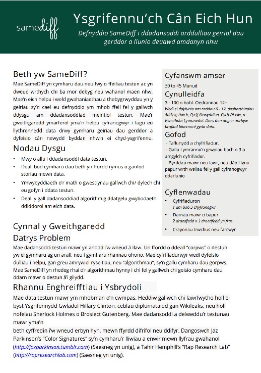 Mae SameDiff yn cymharu un corpws testun â chorpws testun arall i ddangos i chi'r tebygrwyddau a'r gwahaniaethau. Mae'n defnyddio algorithm tebygrwydd cysein i raddio a yw'r dogfennau mewn gwirionedd yn debyg neu'n gwbl wahanol.