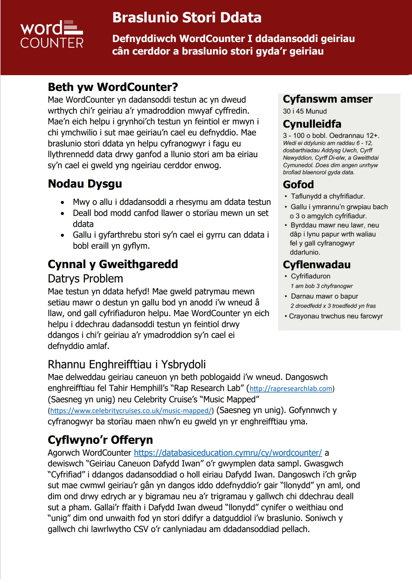 Mae'r offeryn hwn yn eich helpu i gyfrif geiriau, bigramau, a trigramau mewn testun plaen. Yn aml dyma'r cam cyntaf mewn dadansoddi testun meintiol.